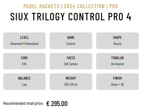 Met zijn ronde vorm en balans in de grip, is de Trilogy Control Pro 4 ontworpen voor nauwkeurige slagen die uw tegenstanders in moeilijkheden brengen. Het frame van koolstofvezel Siux 21K met uitstekende krachtoverdracht wordt gecombineerd met een EVA Soft schuim.